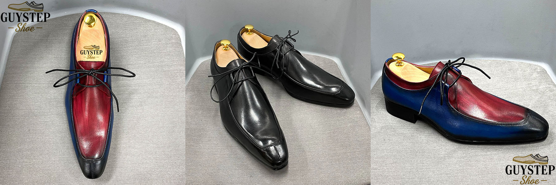 The most striking feature is undoubtedly its artisan color-blocking—a harmonious clash of burgundy, cobalt blue, and jet black, all achieved through meticulous hand-dyeing. This isn’t just color on leather; it’s a narrative of boldness for the man who views his shoes as a canvas. For purists, the all-black iteration offers timeless sophistication, a staple in the “sleek formal leather shoes” search landscape that never fades.