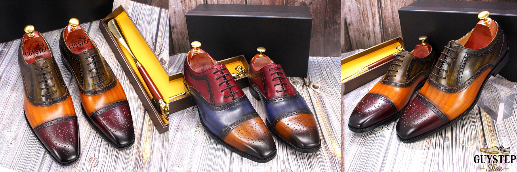 What sets these Oxfords apart is their head-turning color-block panels (think rich red-and-blue or warm brown-and-green combinations) paired with a subtle gradient toe finish. Multi-tonal dress shoes are having a moment, and this design nails the line between statement-making and sophisticated—no loud patterns, just intentional color play that elevates any outfit.