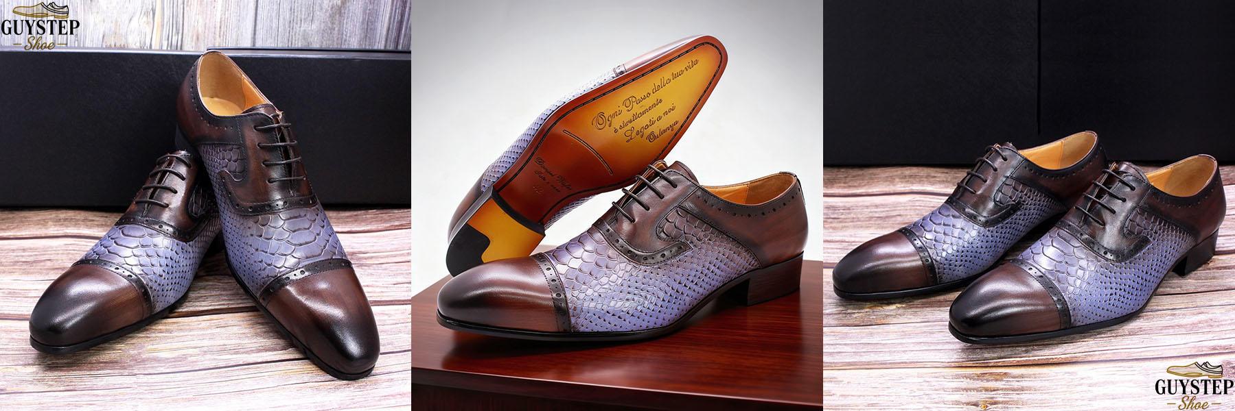 Crafted from premium cowhide leather combined with snakeskin-embossed detailing, this shoe is a masterclass in texture play. The brown and purple color-blocking isn’t just a style choice; it’s a statement that aligns with the rising trend of colorful oxfords for men who dare to stand out. The classic oxford silhouette ensures versatility, making it a worthy addition to both formal and smart-casual ensembles.