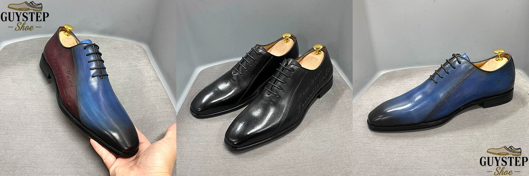 What sets these oxfords apart is their dual offerings: a sleek classic black, and a bold red-blue two-tone that’s been making waves as one of the most sought-after two-tone dress shoes styles. To top it off, the subtle lettering embellishments add a refined, personalized touch—aligning with the rise of embellished dress shoes that feel intentional, not over-the-top.