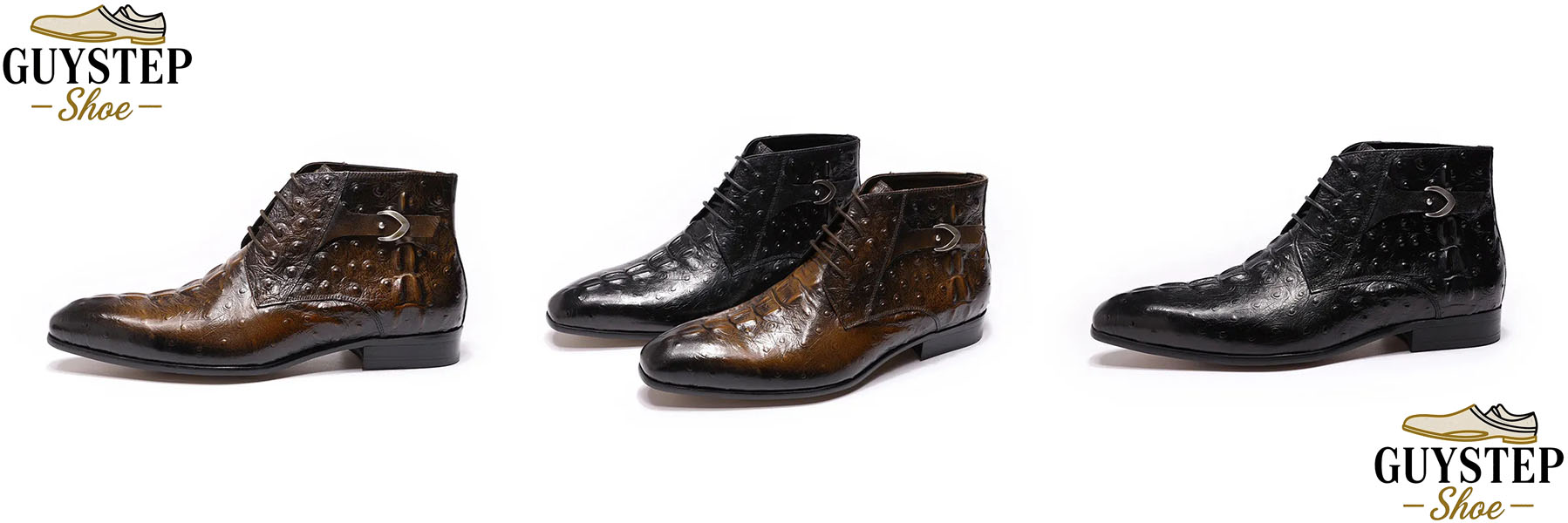 In the lexicon of men’s luxury footwear, few styles command attention like ostrich-embossed dress boots. These ankle boots aren’t just accessories—they’re a declaration of authority. The intricate ostrich pattern, paired with a polished metal buckle, elevates them beyond mere footwear, positioning them firmly in the “exotic leather men’s footwear” trend that’s reshaping how modern men approach power dressing. Where traditional leather boots play it safe, these embrace the boldness of exotic leather innovation, merging the timelessness of handcrafted design with the immediate impact of textured luxury. Whether you’re leading a board meeting or closing a high-stakes deal, they whisper sophistication while shouting confidence, proving that in the world of executive style, details like ostrich embossing aren’t just flourishes—they’re essential.